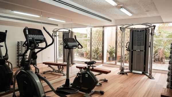 Der Fitnessraum ist um einen elegant gepflegten Innenhofgarten mit natürlichem Licht angeordnet. Er ist mit modernen, professionellen BH-Geräten in einem komfortablen und motivierenden Raum ausgestattet. Unseren Gästen stehen folgende Geräte zur Verfügung: Heimtrainer, Ellipsentrainer, Laufband, Kurzhantel- und Freihantelbereich und ein komplettes multifunktionales Krafttrainingsgerät.